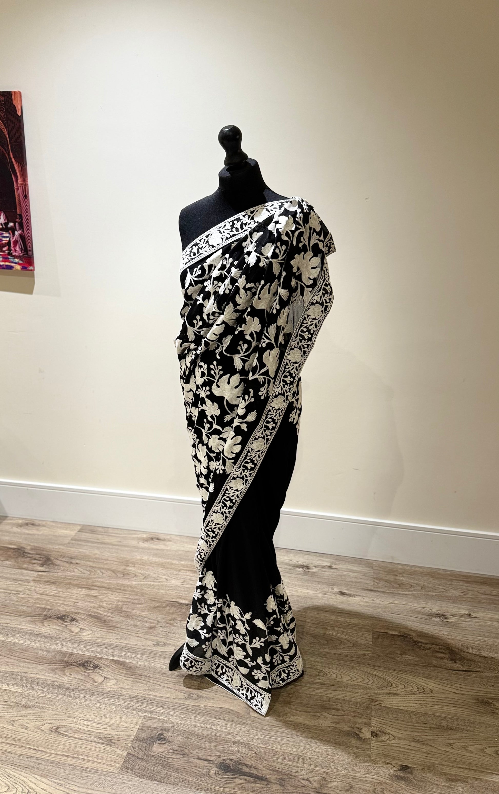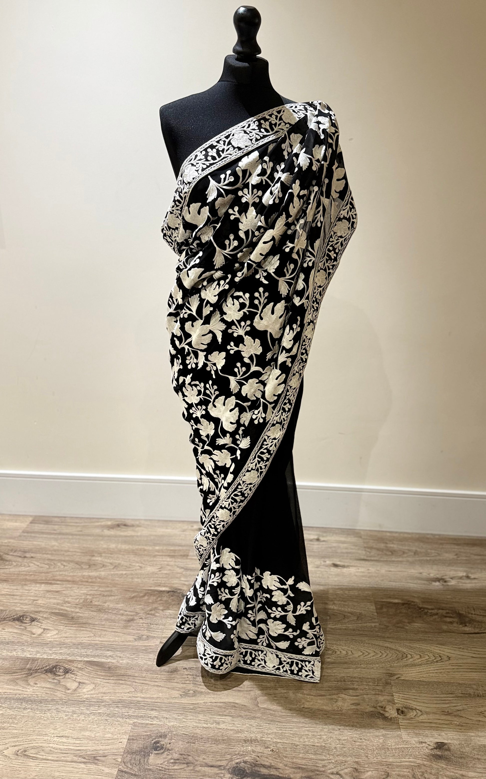 This stunning georgette chinar Aari embroidered saree comes with blouse material attached, crafted in Kashmir