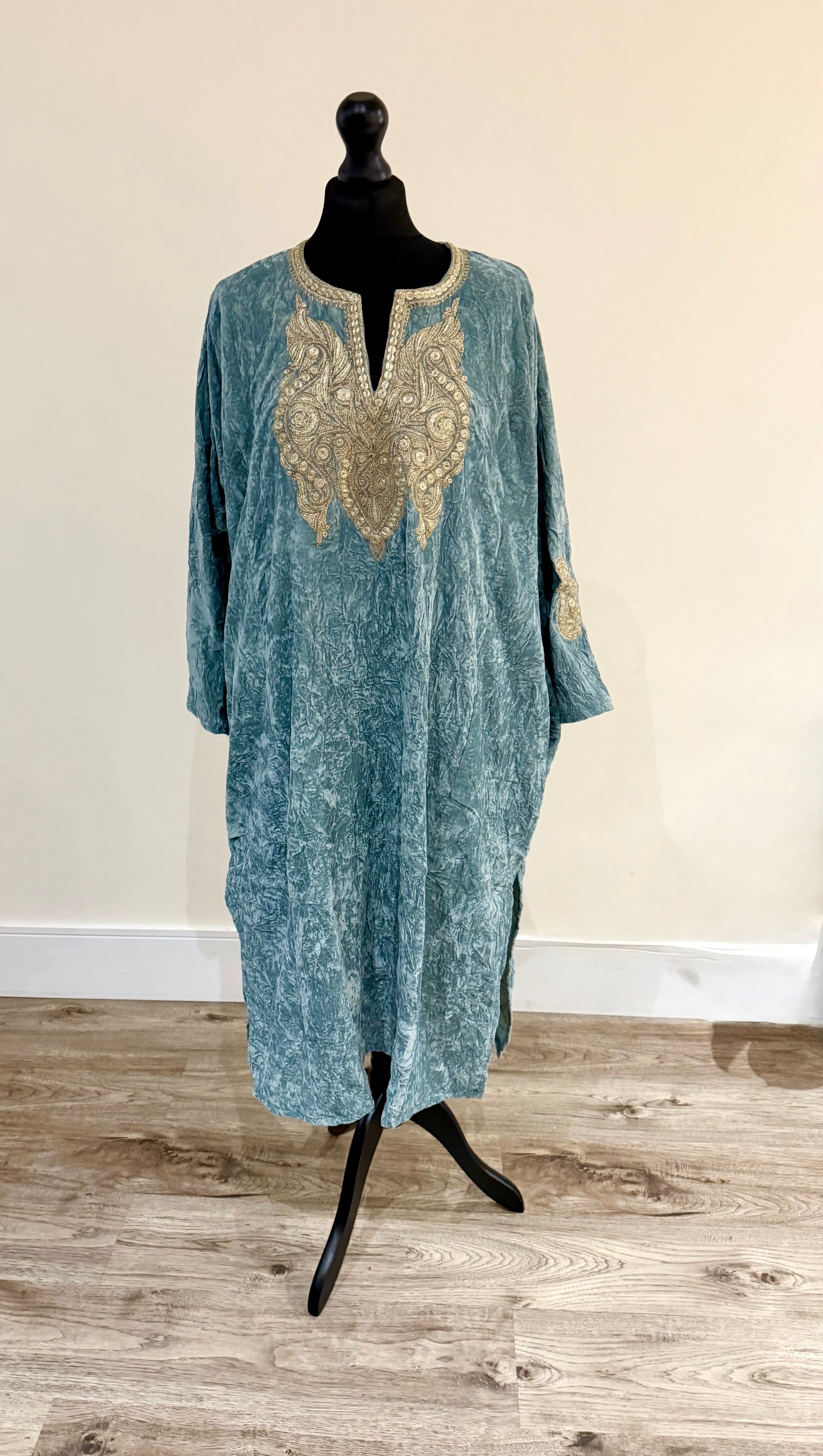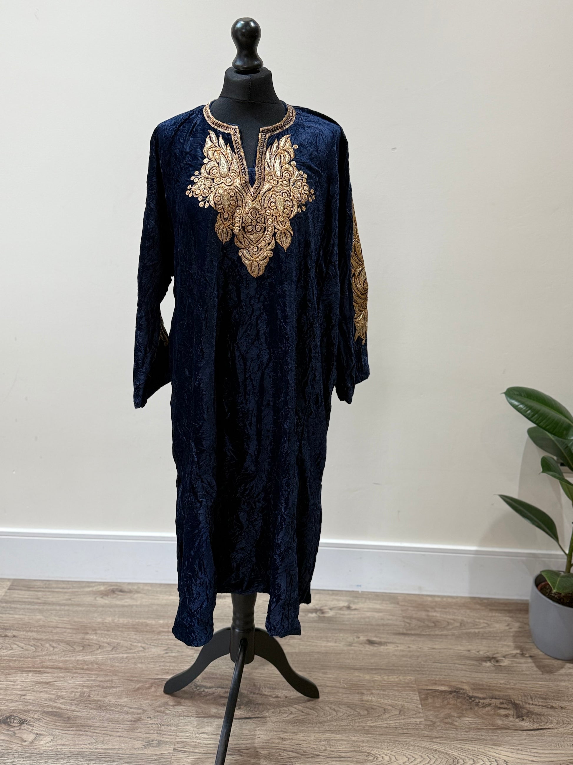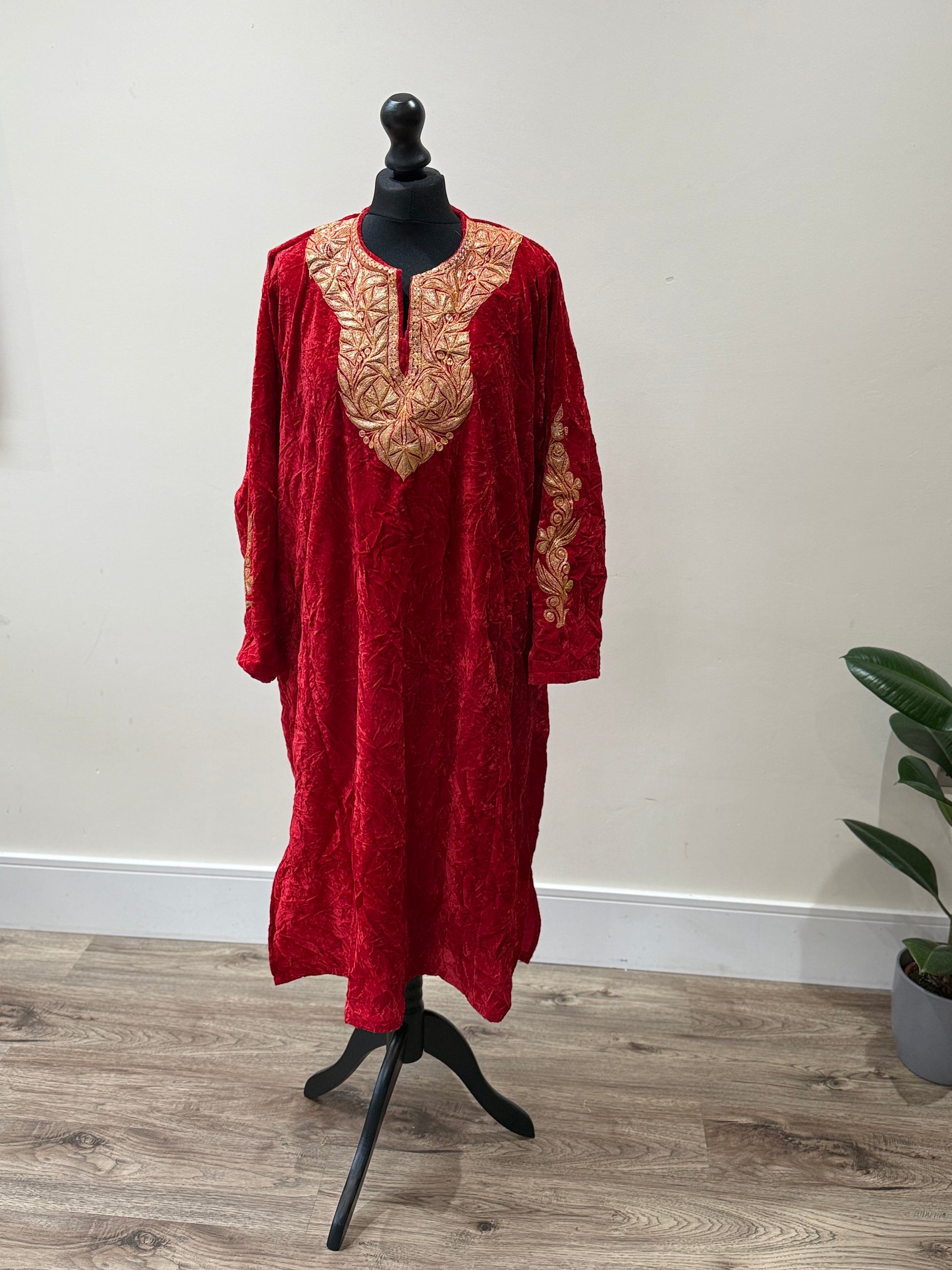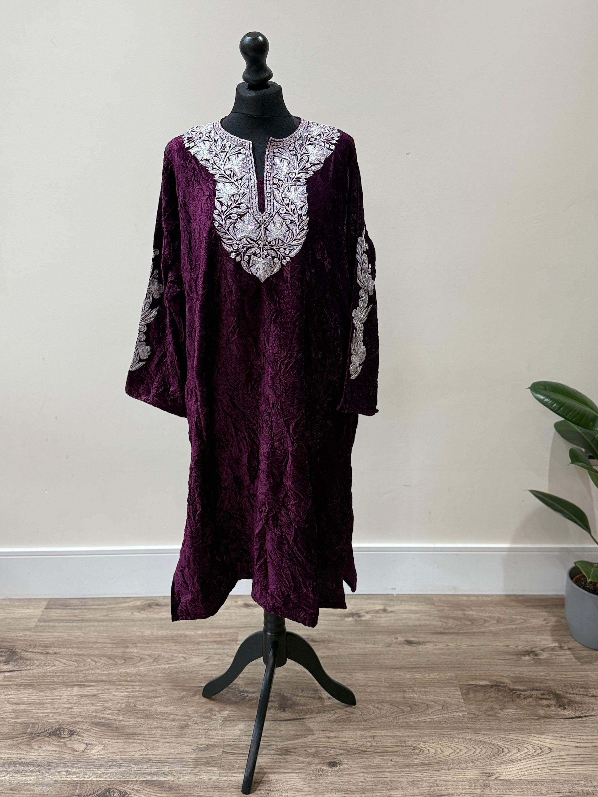This crushed velvet pheran is elegantly adorned with Tilla embroidery, it comes in one size and is available in several colours
