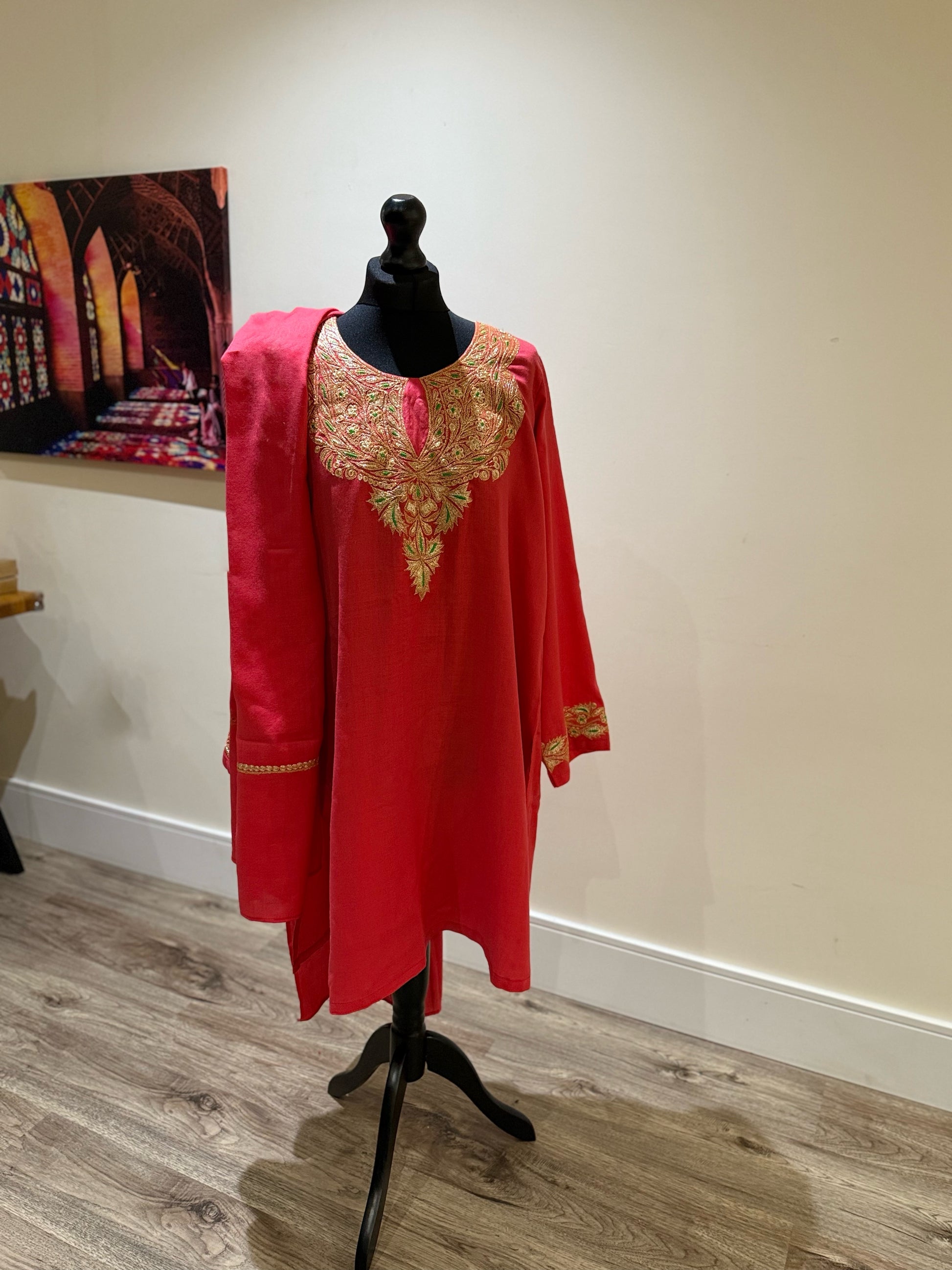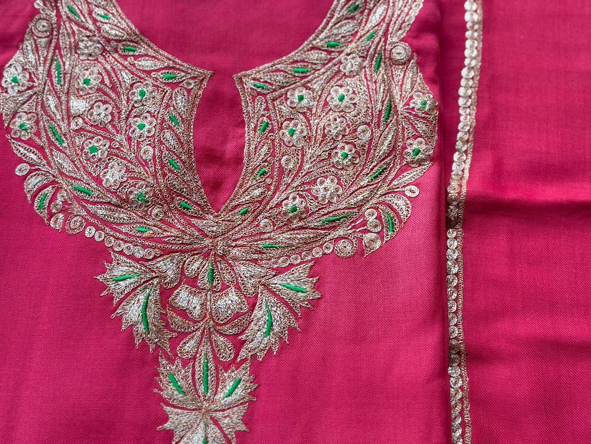 This stunning shocking pink pure wool ensemble features tilla embroidery crafted in Kashmir and comes with a matching dupatta