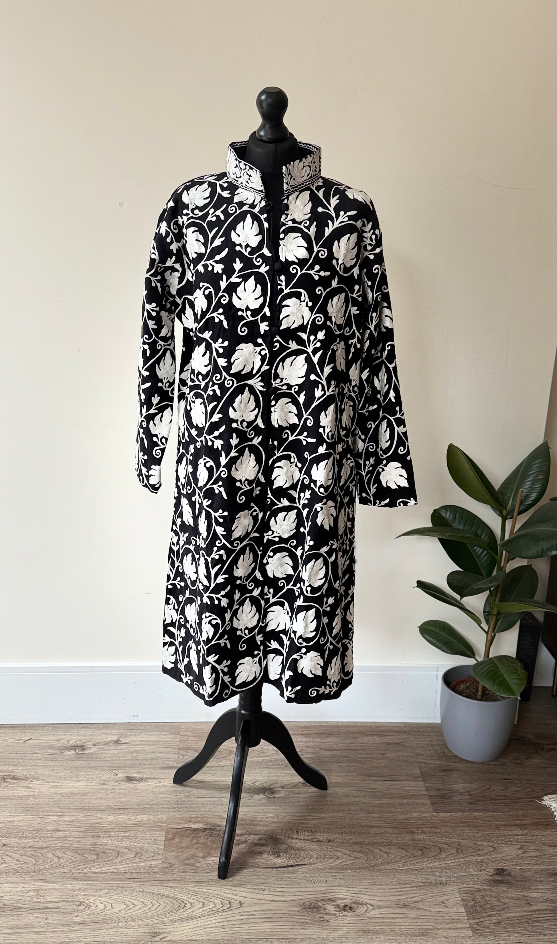 This black woollen Coat is adorned with beautiful white fine hand operated aari embroidery and makes a unique stylish outfit. Please email info@bulbulbagh.com for requirements of customized orders- customized orders take 4-5 weeks.