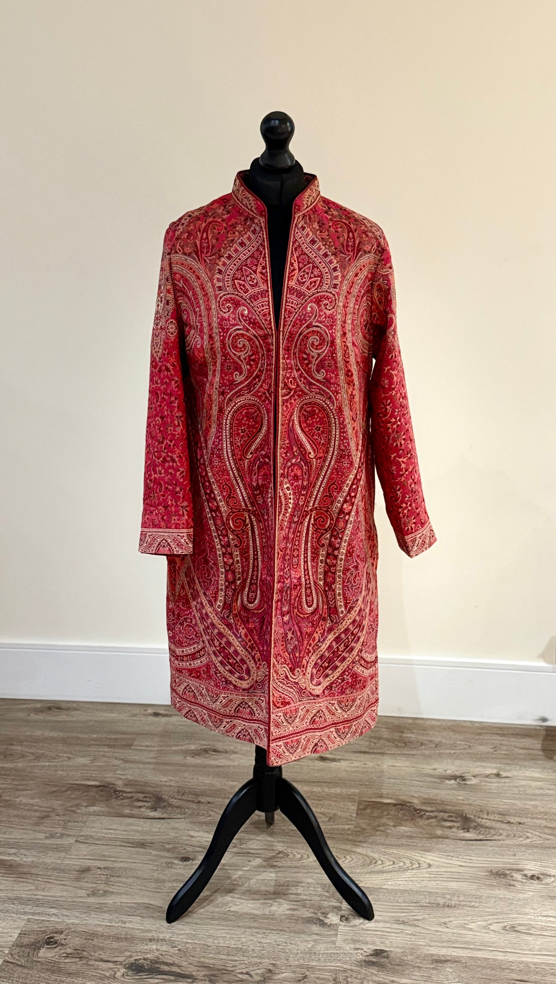 These beautiful woollen coats have been lovingly and skillfully hand embroidered with Kani embroidery in Kashmir and are stunning elegant pieces.