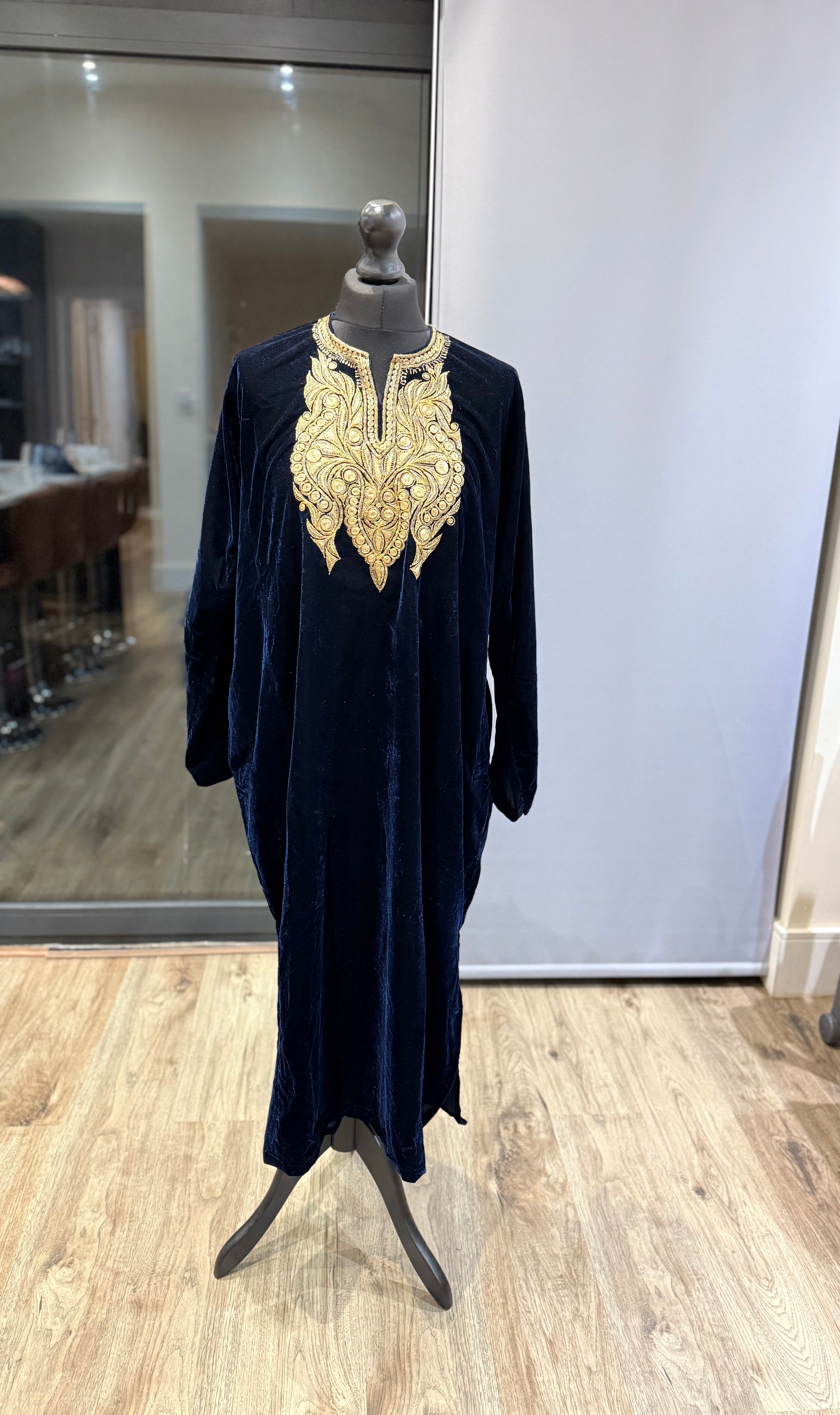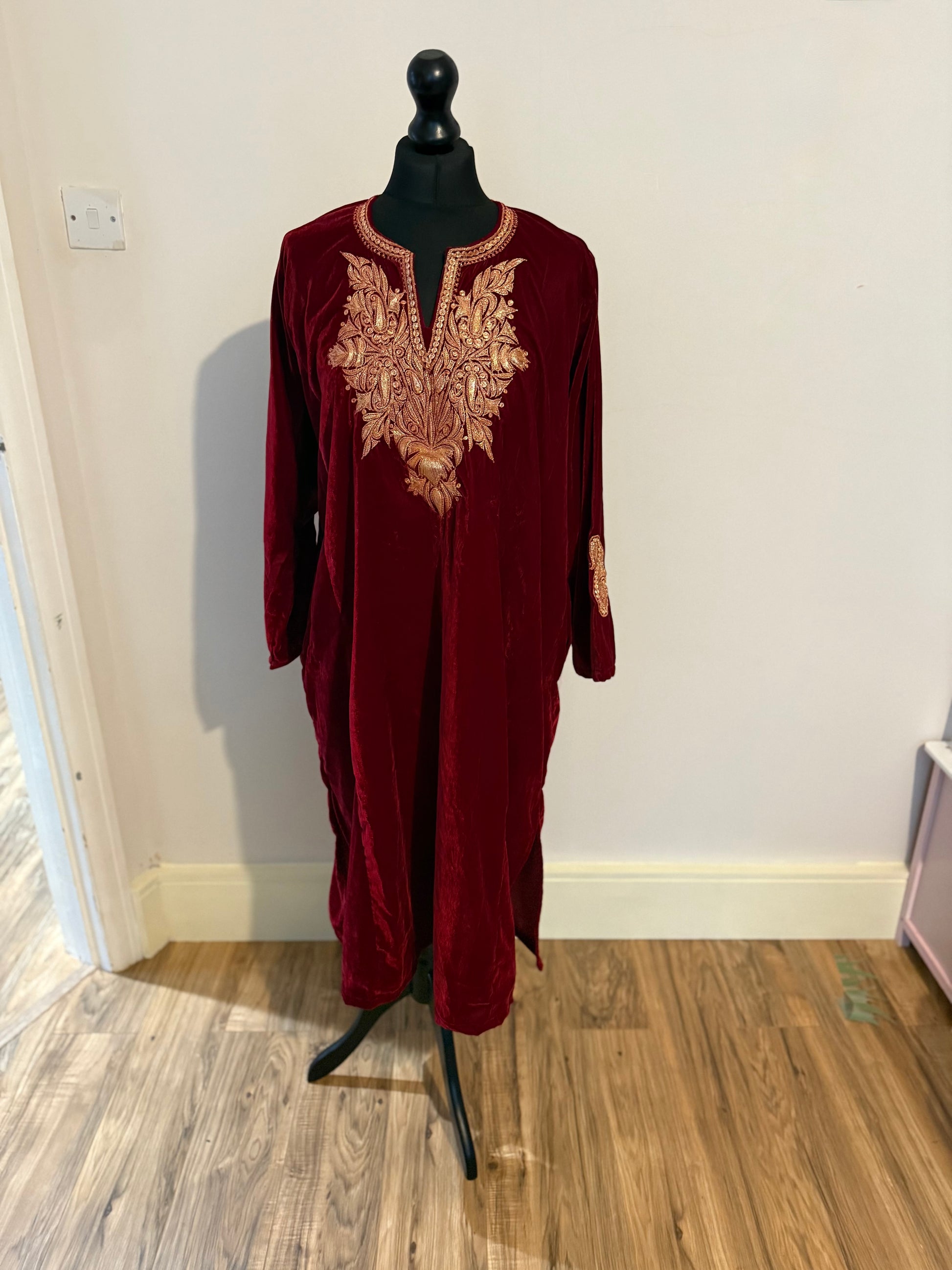 The beautiful velvet pherans are adorned with Tilla embroidery and come in one size (worn loose), crafted in Kashmir